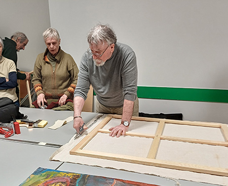 - Prenez 15 adhérents vaillants et motivés. Demandez-leur surtout s’ils possèdent tous les outils nécessaires pour réussir leur marouflage, à savoir une toile brute (coton ou lin peu importe), un châssis, une agrafeuse puissante, des pinceaux plats er propres, un cutter pour égaliser le papier et la toile, de la colle, et un bon tour de main.